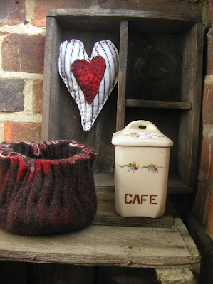 Felt and thrifted cafe jar.I made 2 pleated felt pots for the fair, it was so good to make felt again after a long abstinence! And then we went to the car boot fair on Sunday where I found some lovely stuff including the cafe jar and a length of Timney Fowler b/w fabric from the 80s.
